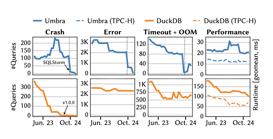 SQLStorm can generate diverse SQL queries at a low cost, effectively revealing performance bottlenecks and errors in database systems. For example, after introducing SQLStorm, Umbra quickly improved its Crash, Error, and Timeout + OOM metrics on SQLStorm by addressing the issues encountered. Additionally, by examining the fourth set of graphs, SQLStorm detected performance degradation issues that were not evident in TPC-H, and these were identified and resolved (Note: Umbra and SQLStorm appear to be from the same team).